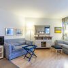 Umlaufende Loggia von ca. 26 m², offene Einbauküche, Mikrowelle, Geschirrspüler, Waschmaschine/Trockner, Duschbad/WC, Fön, 2x TV, Stereoanlage mit Digitalradio, kostenl. W-Lan, Aufzug, inkl. Tiefgaragenstellplatz (Einfahrtshöhe: 1,85 m).