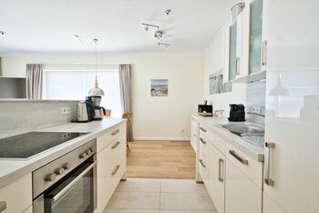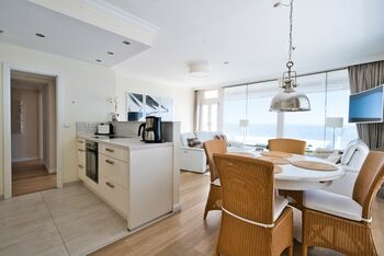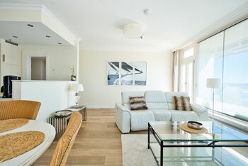 Umlaufende Loggia von ca. 21 m², elektr. Markisen, Küche, Geschirrspüler, Duschbad/WC, Fön, TV, Stereoanlage, kostenl. W-Lan, Aufzug, inkl. Tiefgaragenstellplatz (Einfahrtshöhe: 1,85 m).